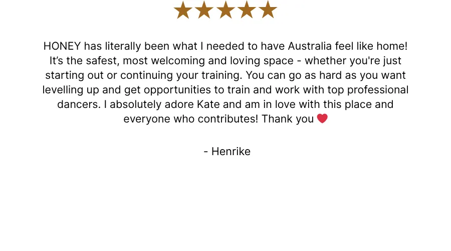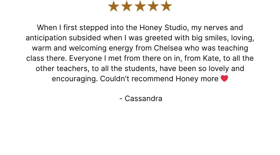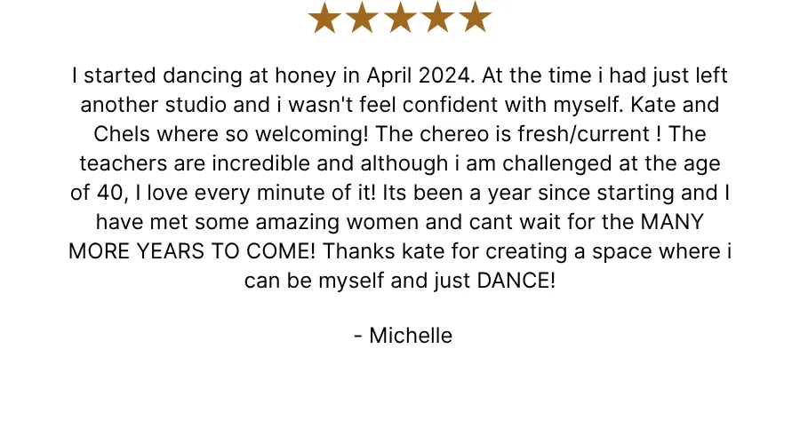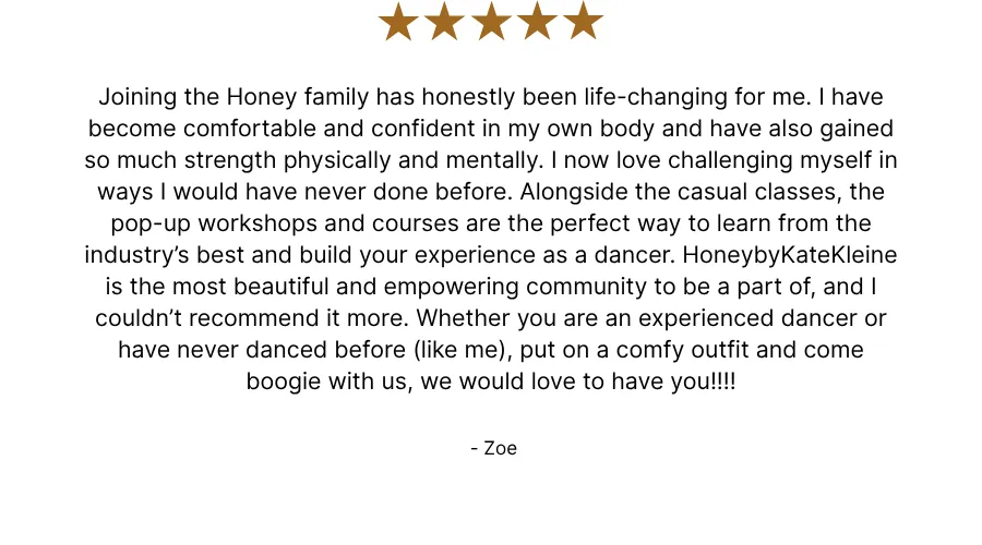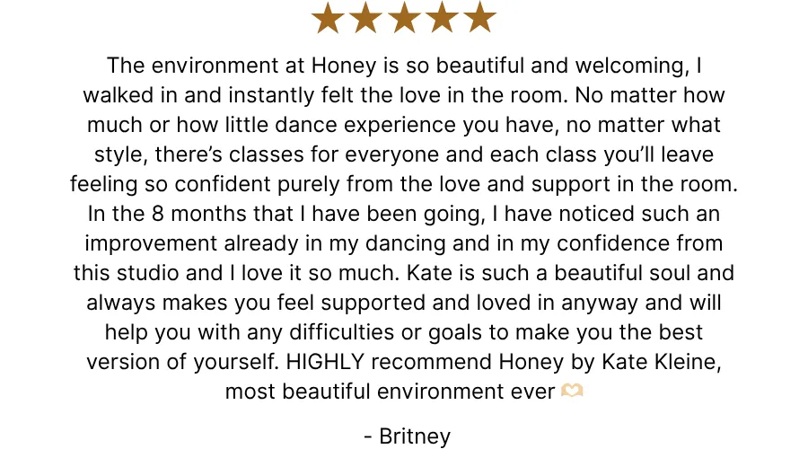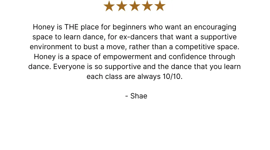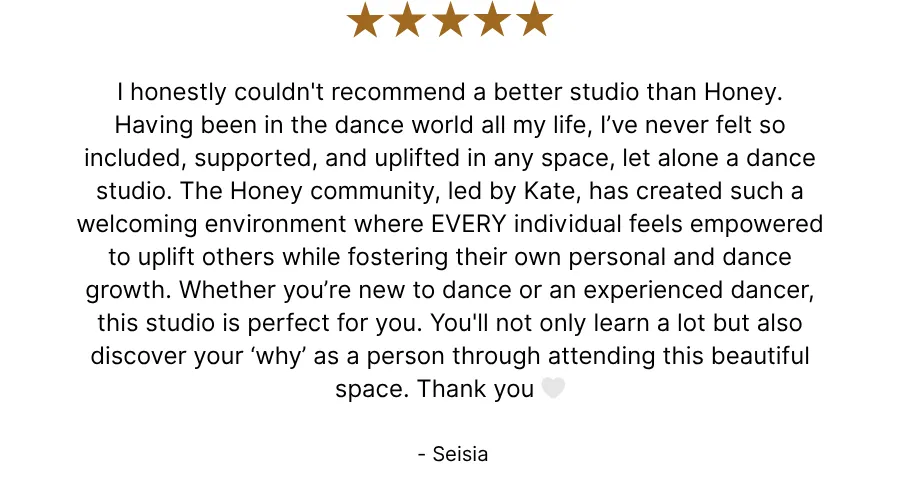 "The environment at Honey is so beautiful and welcoming, I walked in and instantly felt the love in the room... I have noticed such an improvement already in my dancing and in my confidence from this studio and I love it so much."