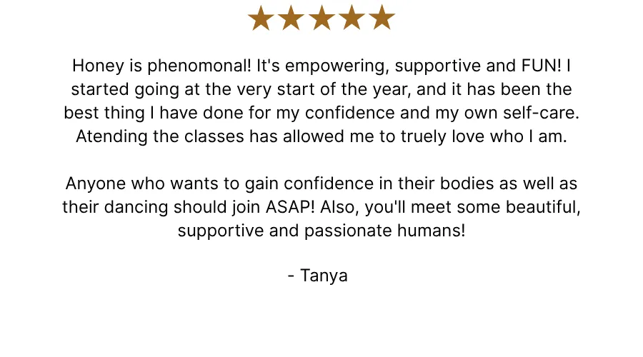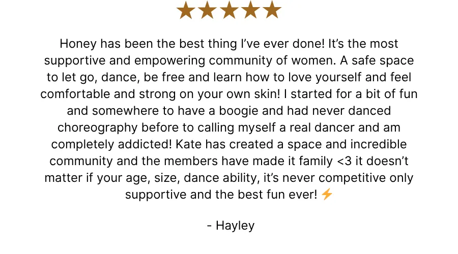 "Honey has been the best thing I’ve ever done! It’s the most supportive and empowering community of women. A safe space to let go, dance, be free and learn how to love yourself and feel comfortable and strong on your own skin!"